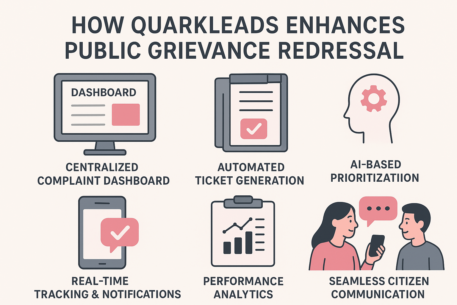 QuarkLeads brings automation, AI, and centralized management to modern grievance redressal. Here’s how it helps governments and organizations streamline citizen service delivery: